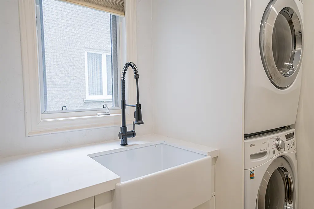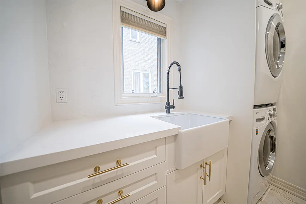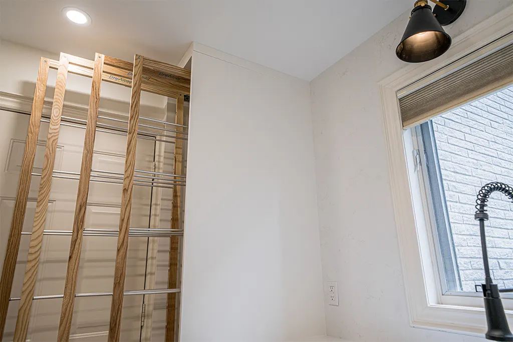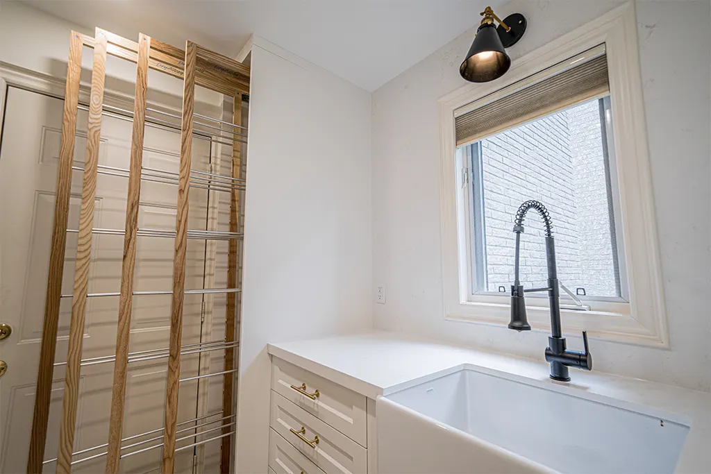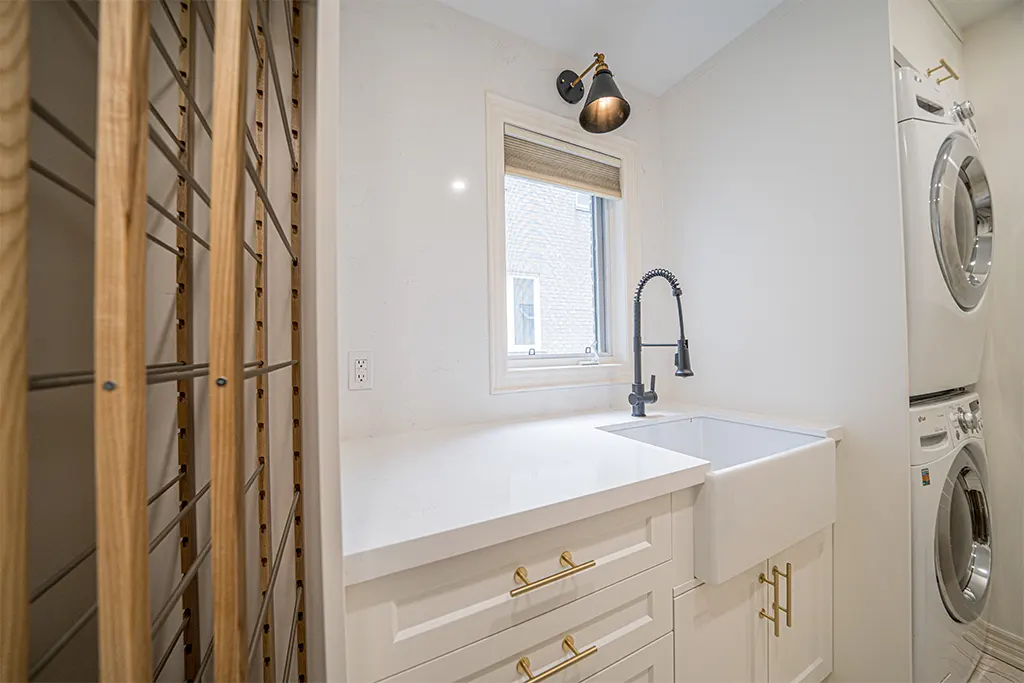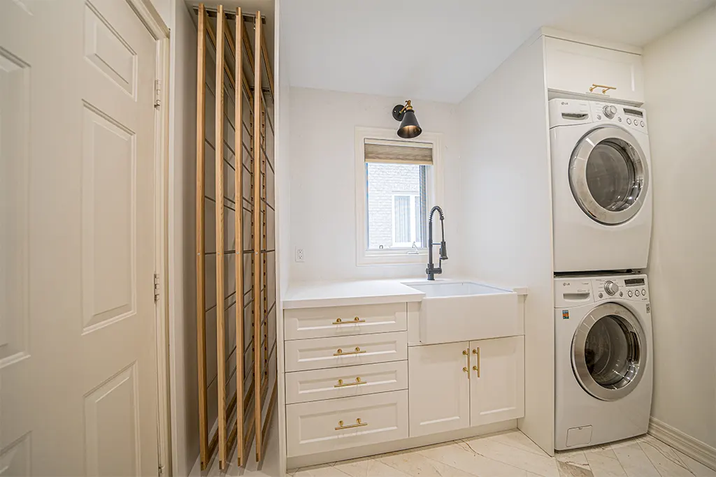 Laundry Room Makeover Tiles, Relocation of appliances, Quartz, fixtures, lighting and added dry-away system.