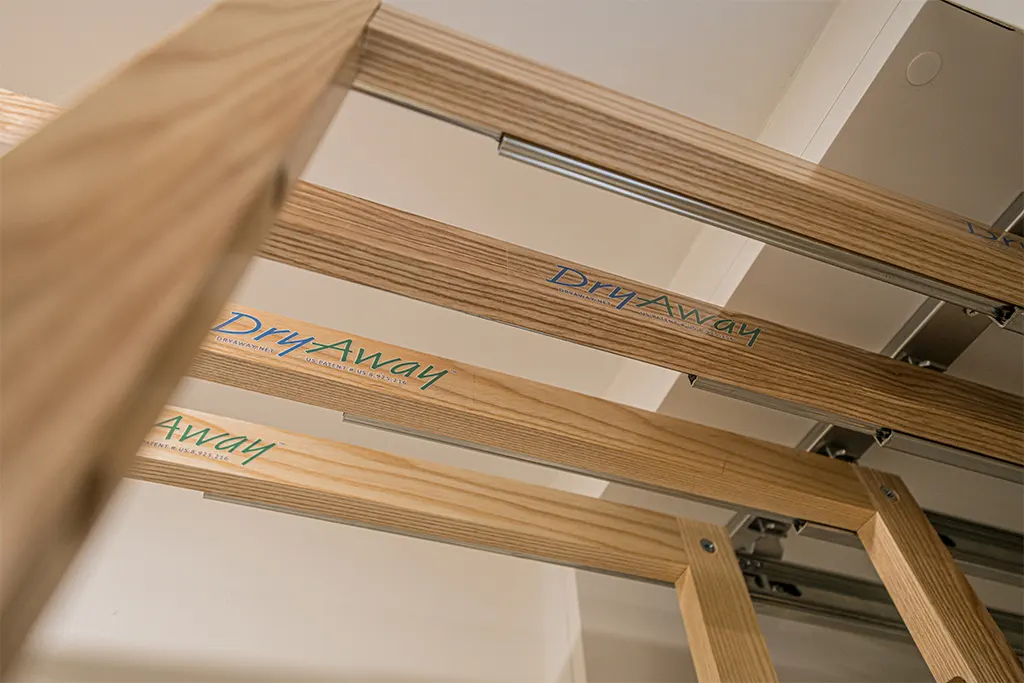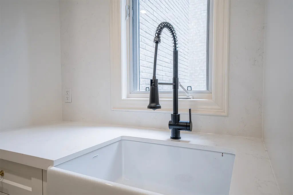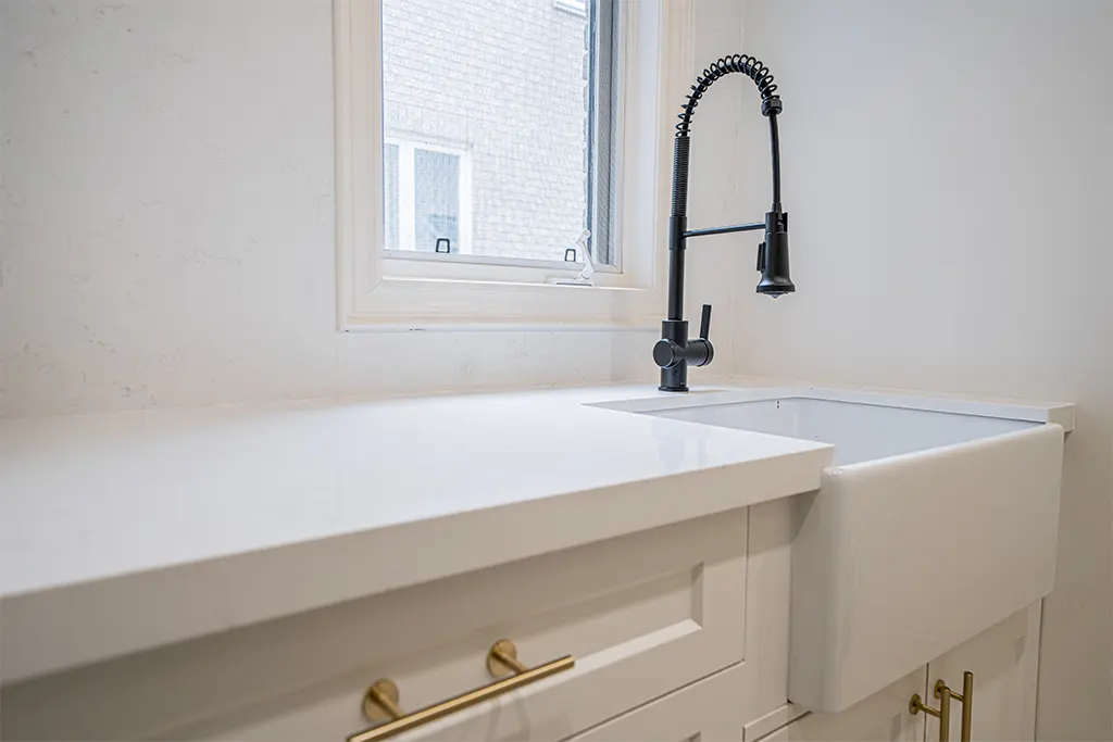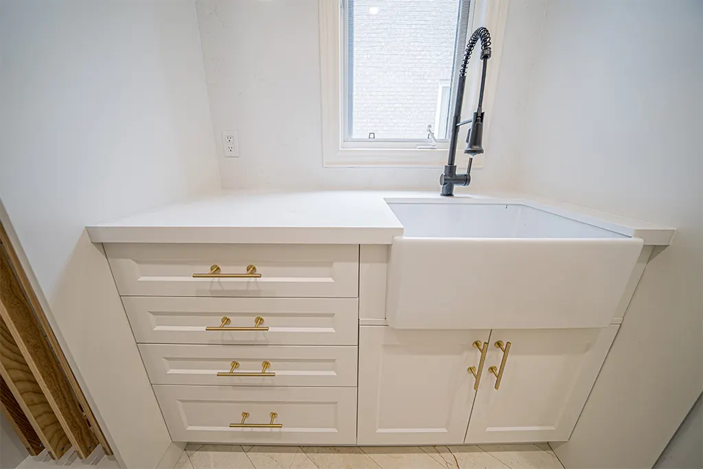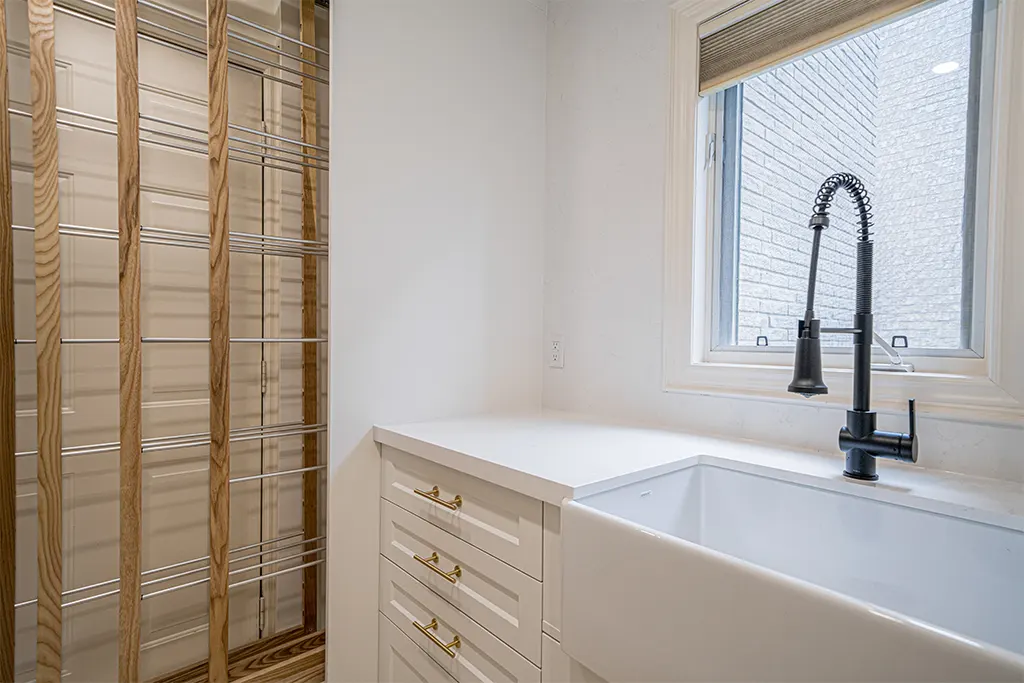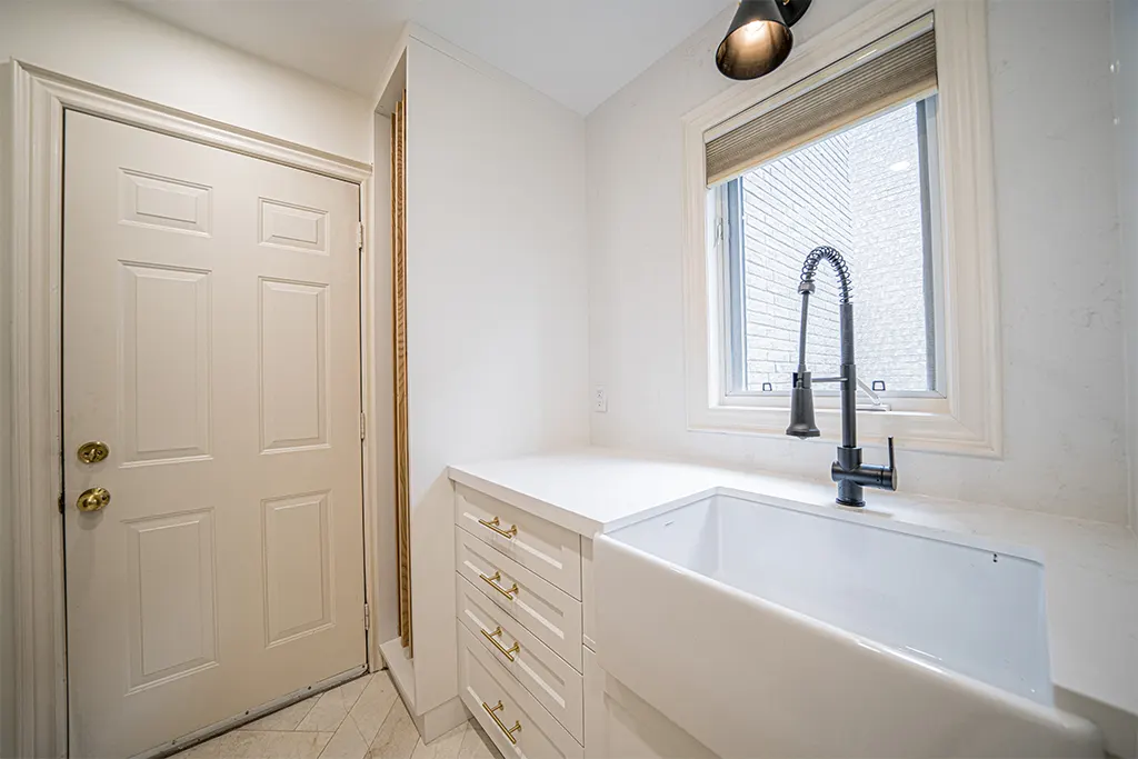 Laundry Room Makeover Tiles, Relocation of appliances, Quartz, fixtures, lighting and added dry-away system.